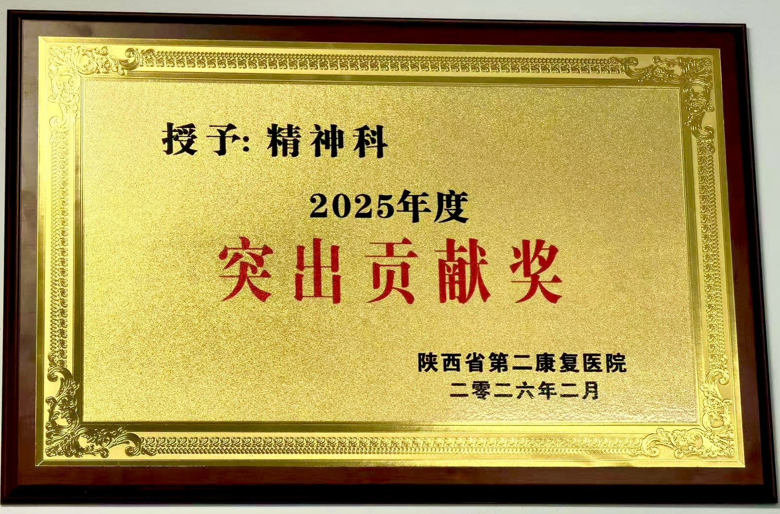 2026-03-18近日,在陕西省第二康复医院2026年工作会议上,精神康复科凭借精湛的诊疗技术、优质的医疗服务与强烈的社会担当,综合实绩突出,荣获突出贡献奖。这份荣誉,是对科室全体医护人员深耕精神卫生事业、守护群众心理健康的高度肯定,更是对团队坚守初心、仁心护心的最好褒奖。硬...